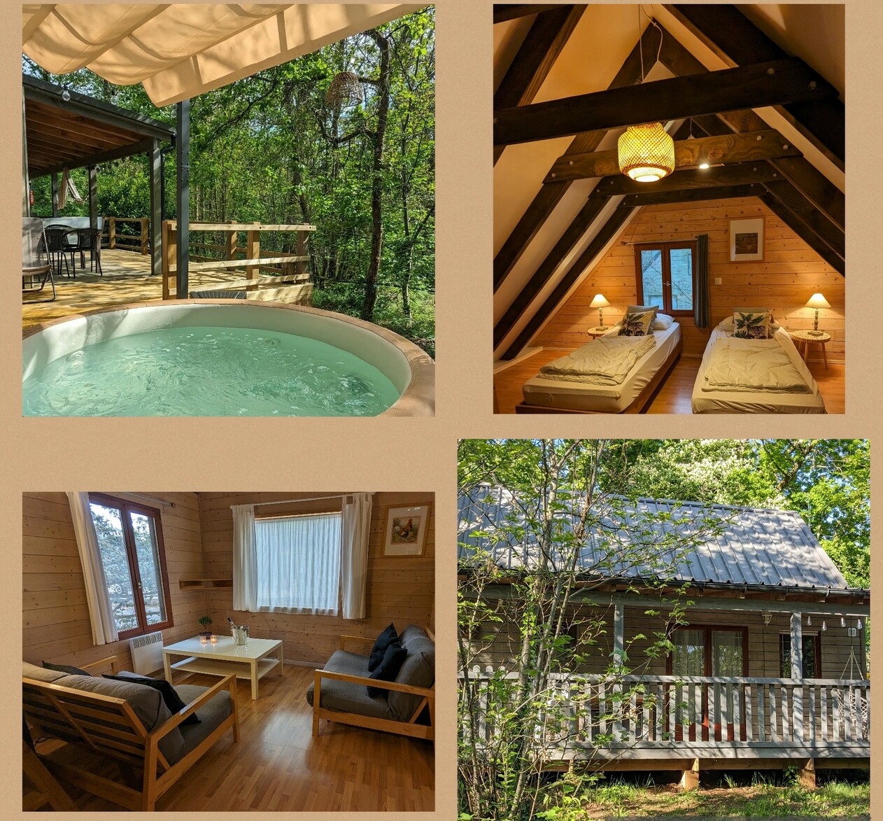 Castelwood est un petit parc de chalets situé dans les bois, au pied de la colline sur laquelle se trouve le château de Biron . Ce beau et tranquille parc avec piscine chauffée se compose de 12 chalets en bois spacieux, de 4 chalets avec des SPA privatifs, de 3 tentes sur pilotis et d'une cabane perchée... nos lodges sont tous confortablement meublés pour 4, 5 ou 6 personnes. Il y a également un chalet adapté aux personnes à mobilité réduite. Nichés au milieu des arbres, les chalets tout en bois de Castelwood ont chacun une superficie de plus de 50 m2 et une terrasse spacieuse. Passer des vacances à Castelwood, c'est passer des vacances au milieu de la magnifique nature de la Dordogne, et c'est avant tout se reposer et se détendre.